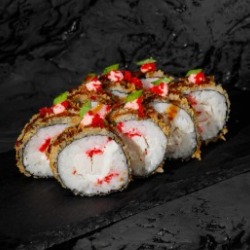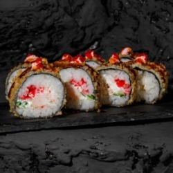 Состав: рис, нори, творожный сыр, снежный краб, сухари панко, икра масаго, зеленый лук 8 шт. 270 гр .