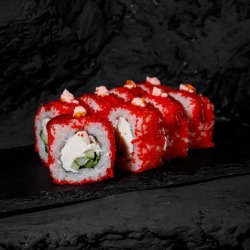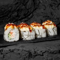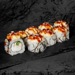 Состав: рис, снежный краб, творожный сыр, огурец, нори, кунжут, соус унаги, соус лава(майонез и икра масаго) 8 шт. 250 гр .