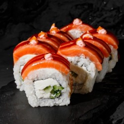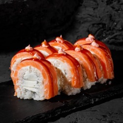 Состав: лосось, рис, творожный сыр, нори, соус унаги, огурец 8 шт. 250 гр .