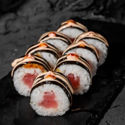 Состав: рис, тунец, нори, соус унаги, спайси соус 8 шт. 200 гр .