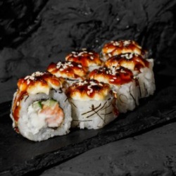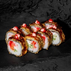 Состав: рис, лосось, творожный сыр, огурец, икра масаго, нори, сухари панко, унаги-соус 8 шт. 270 гр .